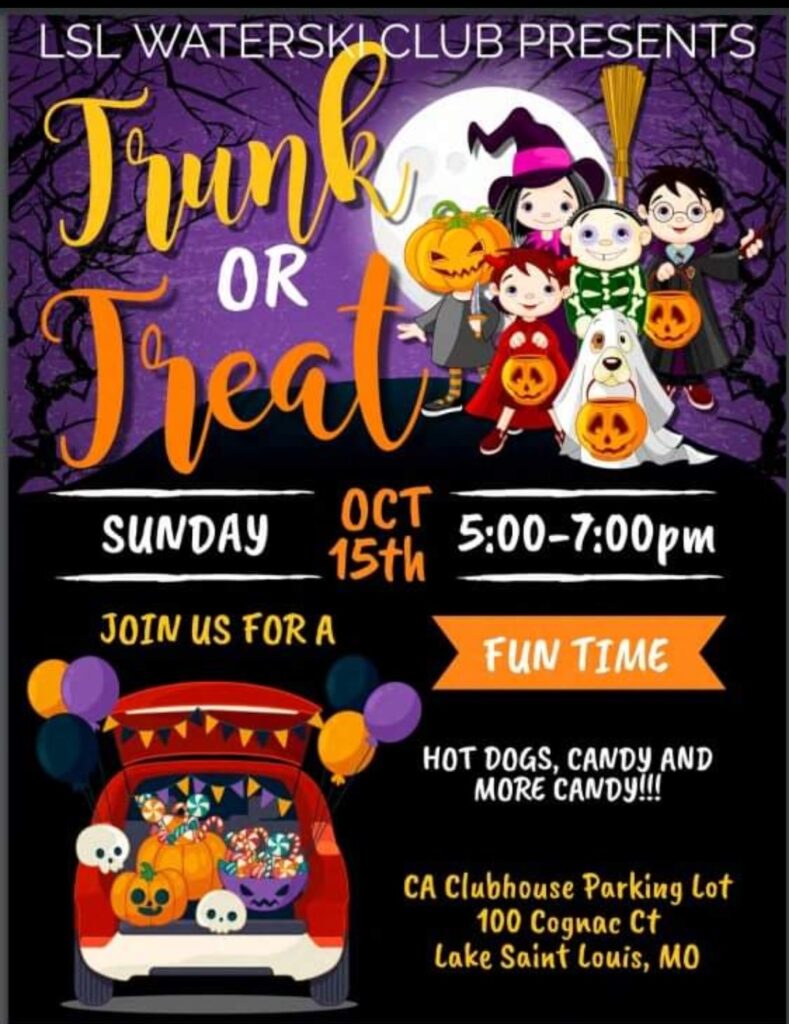 Lake Saint Louis Water Ski Club is organizing. This trunk or treat event on October 15th from 5:00 – 7:00 pm in the Club House. 100 Cognac CT. Lake Saint Louis,Mo