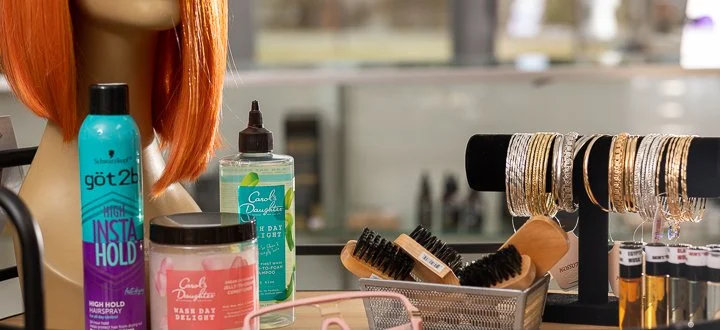 - Wigs, braids, and hair extensions in multiple textures and lengths